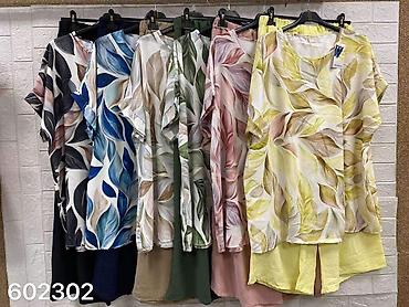 - Dvodijelni komplet: lepršava tunika sa kratkim rukavima + široke pantalone ravnog kroja.