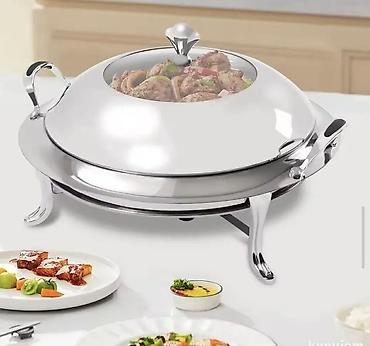 - Okrugli grejač/posuda za posluživanje od visokopoliranog nerđajućeg čelika.