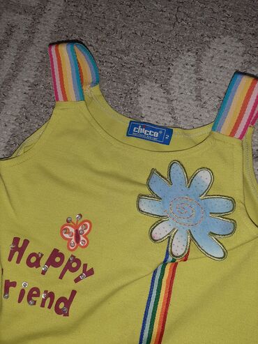 Dečija majica S&D, veličina 12–13 (označeno 152). Cena: 220 RSD. Opis: - Kratki rukavi, okrugli izrez. - Prednji deo sa živopisnim printom u boji (motiv sa cvećem i likom). - Zadnji deo u ko...