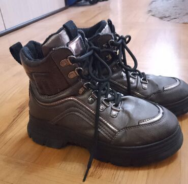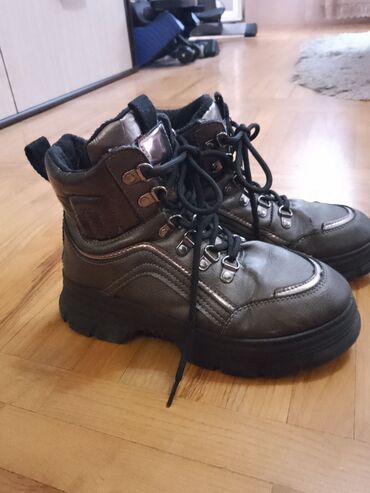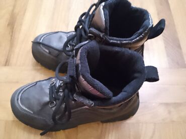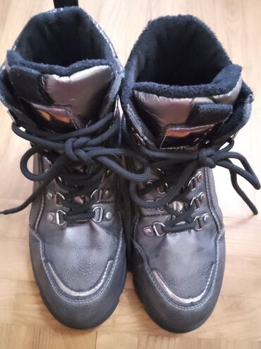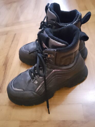 Zimske ženske čizme sa toplom krznom postavom i ravnim platformskim đonom. Gornjište kombinacija glatkog materijala i ojačanja na prstima i peti, sa ukrasnim šavovima. Klasično vezivanje sa metalni...