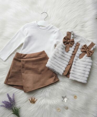 Kompletic za devojcice ✨🤎 3u1 komplet za male princeze 🤎✨ Cena 3650 Sadrži braon suknjicu–šorc od velura, udobnu rebrastu polu rolkicu od pamuka i mekani krzneni prsluk ukrašen mašnicama u boji suk...