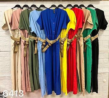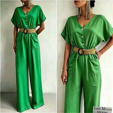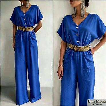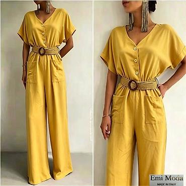 Ženski kombinezon sa širokim nogavicama i kratkim rukavima. Ležeran,ravne široke nogavice,preklopni kragnasti okovratnik,kratki rukavi sa blago podvrnutim rubom. - U struku elastična guma koja obli...