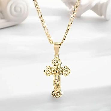 - Dizajn: figaro lančić srednje širine sa poliranim i isečnim karikama; privezak ukrštenog oblika sa reljefnim prikazom raspeća i dekorativnim ornamentima na krajevima krsta