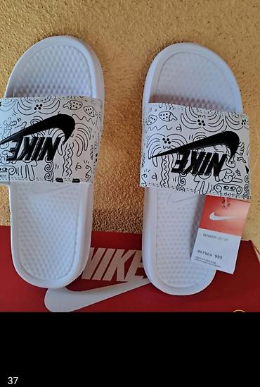 - Nike Benassi JDI – potpuno beli model sa crno‑belim grafičkim printom na strapu