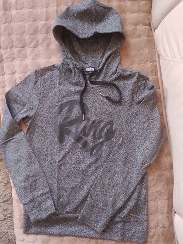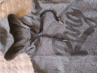 Siva ženska dukserica sa kapuljačom i rajsferšlusom. - Veličina: S-M - Dužina: 60 cm - Poluobim: 45–55 cm - Materijal: 95% pamuk (etiketa prikazana) - Detalji: dekorativne zvezde na predn...