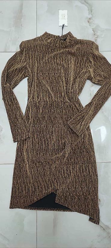 - Materijal: elastična tkanina sa metalik zlatnim nitima koje daju diskretan sjaj i teksturirani rebrasti izgled; prijatna i rastegljiva za udobno pristajanje.