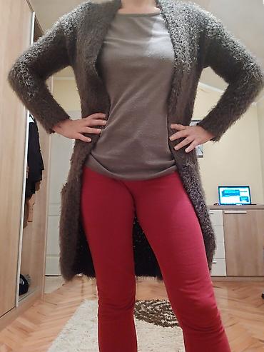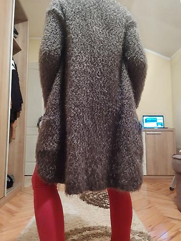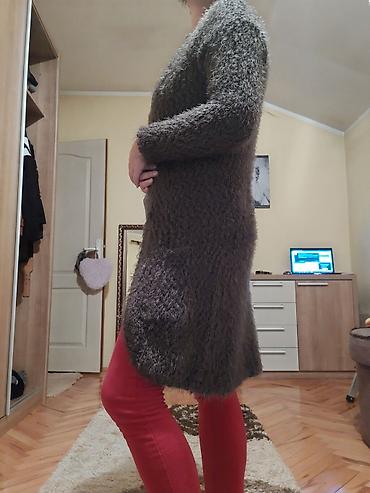 Dug kardigan od „mohair“ efekta, bez kopčanja, u sivo-braon nijansi.