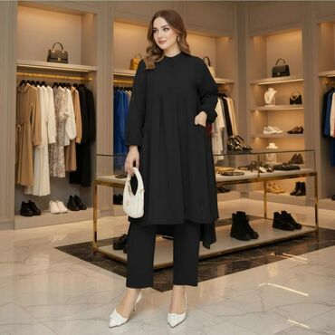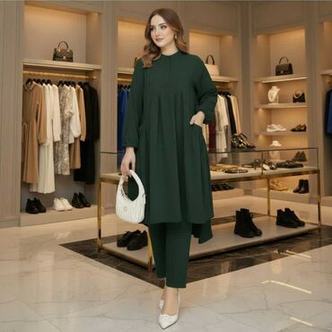 - Kroj: ležerna A-linija tunike sa blagim naborima ispod grudi; blago produžena zadnja strana. Ravne pantalone srednje širine, dužine do članka.
