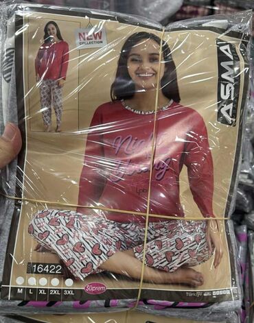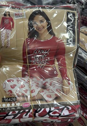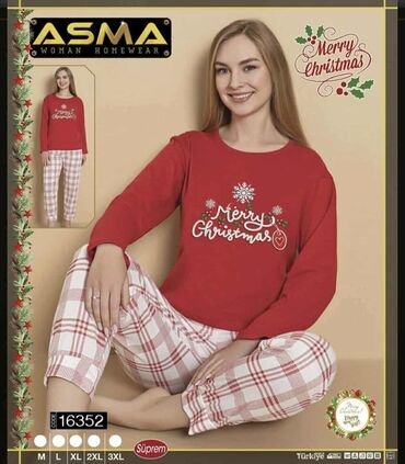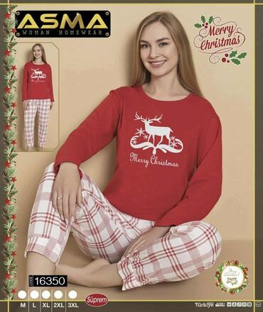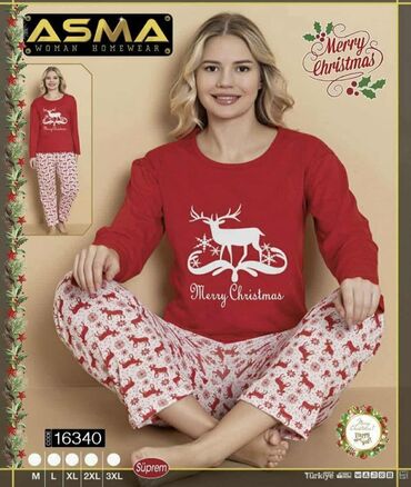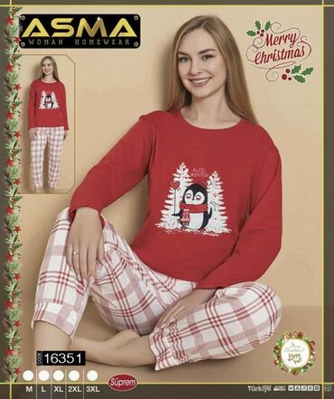 - Dizajn: crvene bluze sa božićnim motivima i natpisom “Merry Christmas” (jelen, pahulje, pingvin “Hello Winter”). Pantalone sa kariranim crveno‑belim uzorkom ili printom jelena i pahulja.