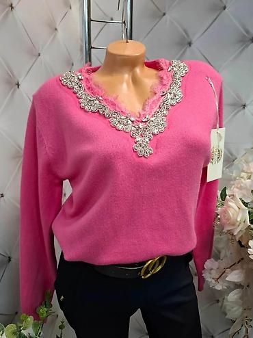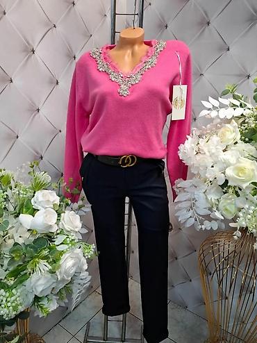 - Džemper: intenzivno roze boje, nežno pletivo sa V-izrezom. Oko izreza je dekorativna aplikacija od čipke i perlica u srebrnom tonu koja daje svečan, ženstven izgled. Duži rukavi, udoban kroj pogodan za svakodnevno nošenje i posebne prilike.