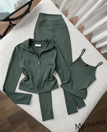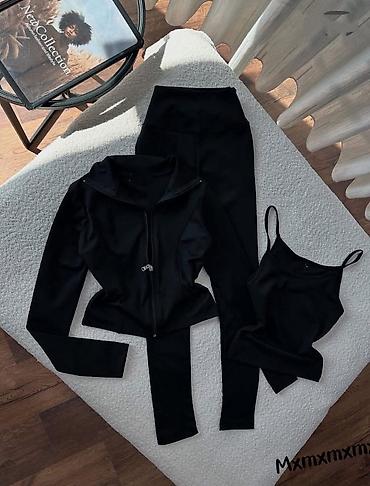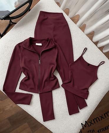 - Sastav: prsluk-top na tanke bretele, uske helanke sa visokim strukom i sportska jakna sa rajsferšlusom i kragnom.
