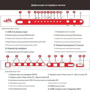 - Улази: HDMI, коаксијални, оптички (TOSLINK), USB, Bluetooth 5.0, PC‑USB (HIFI USB Music Player)