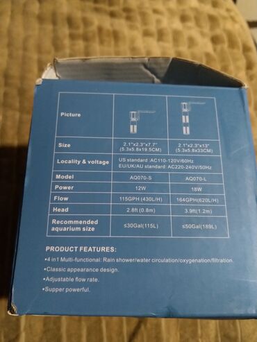 U paketu je unutrašnji filter sa prskalicama kako je prikazano na kutiji. Model AQ070-18W je namenjen srednjim do većim akvarijumima do 189 litara.
