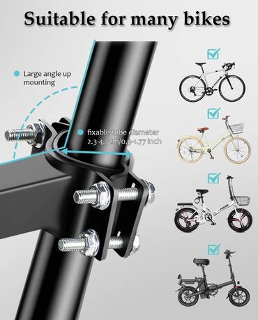 - Univerzalni model za montažu na većinu klasičnih, gradski, sklopivih i električnih bicikala (stezna šelna odgovara cevima prečnika približno 2,3–4,5 cm).