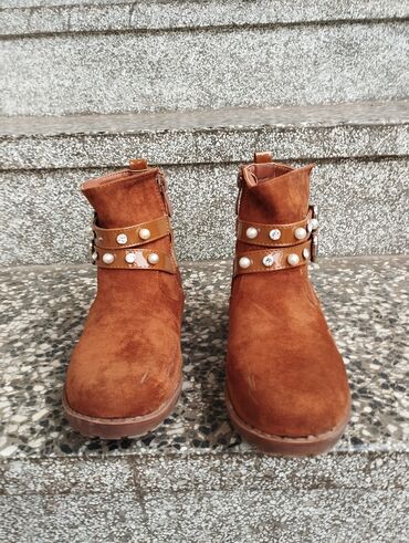 Dečje zimske čizmice sa krznom i kopčom - Model: kratke čizmice sa mekanim veštačkim krznom po ivici i unutrašnjosti - Spoljašnjost: materijal koji podseća na brušenu kožu - Kopča sa metalnom šnal...
