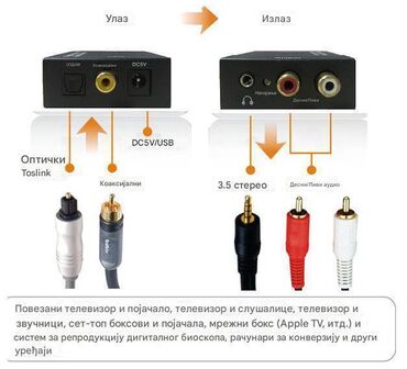 - Set-top box, mrežni plejeri (npr. Apple TV), računari i drugi uređaji za konverziju digitalnog zvuka u analogni.