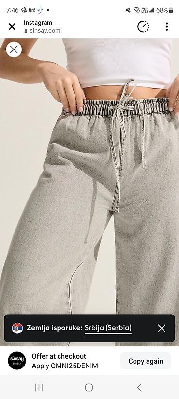 Ženske uske farmerke od tamno plavog denima sa elastinom. Klasik kroj sa srednjim strukom, uskim nogavicama i pet džepova. Napred, oko prednjih džepova, nalazi se dekor od sitnih i srednjih biserni...