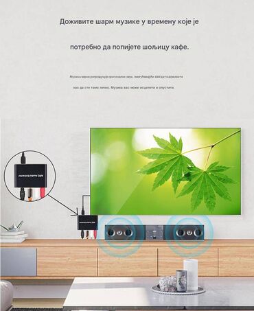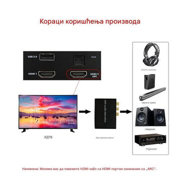- Uređaj izvlači zvuk sa TV‑a preko HDMI ARC ulaza i pretvara ga u više audio izlaza za povezivanje sa pojačalom, soundbarom ili klasičnim aktivnim zvučnicima.