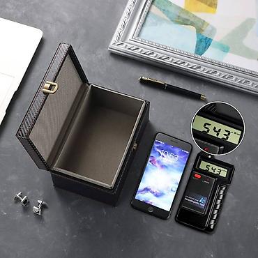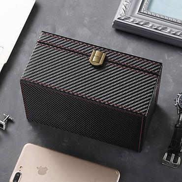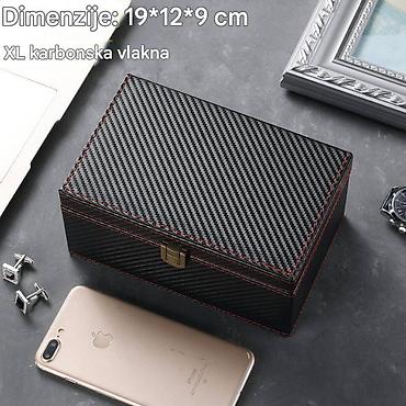 Robusna i stilizovana kutija koja čuva i organizuje vaše dragocenosti uz moderan “carbon” izgled. Dimenzije: 19 × 12 × 9 cm.