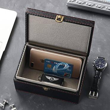 - Materijal: spoljašnjost sa uzorkom karbonskih vlakana, dekorativni crveni štep; unutrašnjost obložena finom tkaninom za zaštitu predmeta
