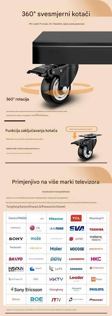 - Univerzalni stalak kompatibilan s više marki televizora (npr. Sony, Samsung, LG, Panasonic, Philips, TCL, Hisense, Xiaomi i dr.).