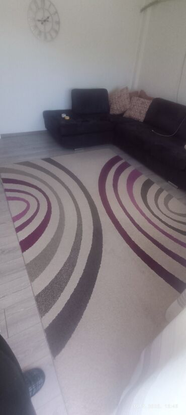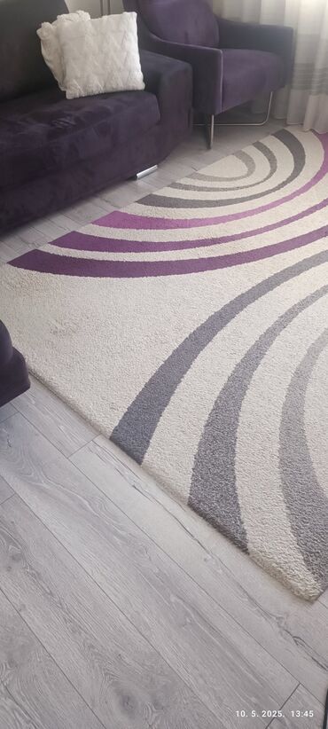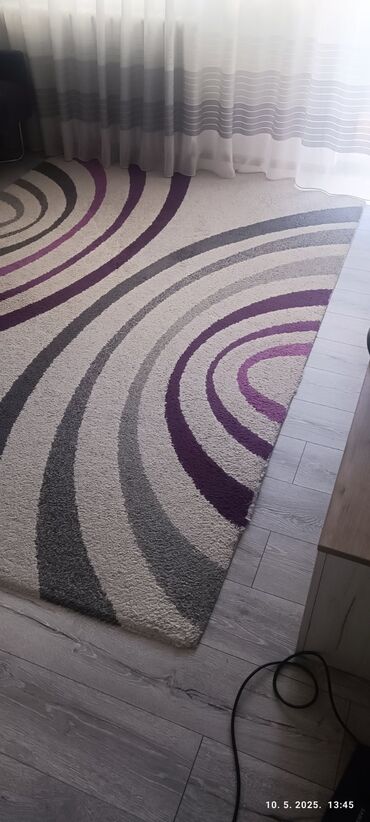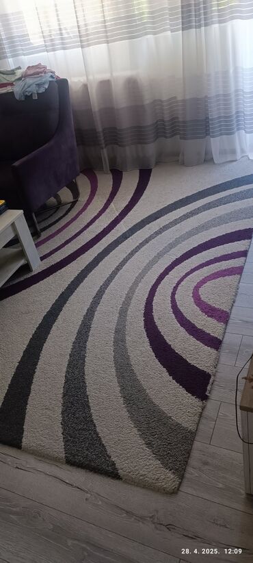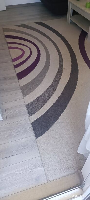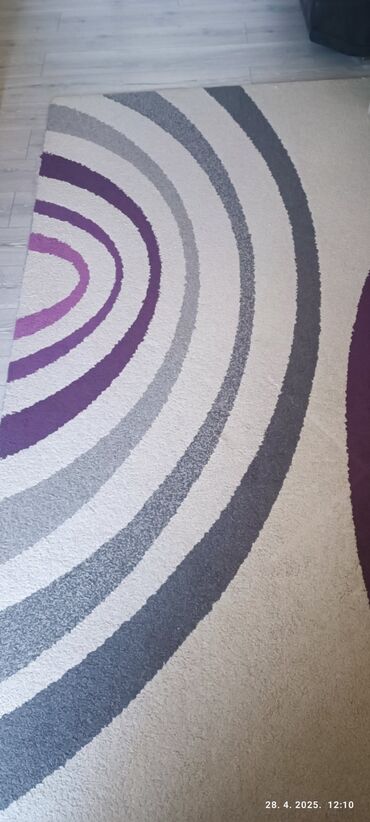 Moderan sobni tepih sa apstraktnim koncentričnim lukovima. U besprekornom stanju.Kao nov. Cist-opran. Kupljen u Galeriji podova. Belgijski.