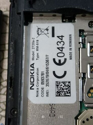 - Uklonjiva zadnja maska sa ležištem za SIM karticu i bateriju; oznake unutar kućišta: Model 2720a-2, Type RM-519, Made in Romania, CE 0434.