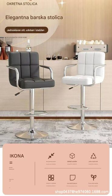 - Stil: jednostavan, udoban i stabilan; pogodno za kuhinjske šankove, barove, kafee, kozmetičke i frizerske salone