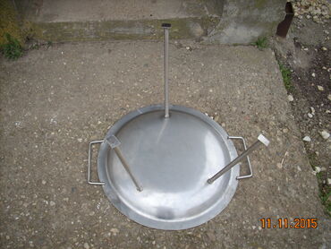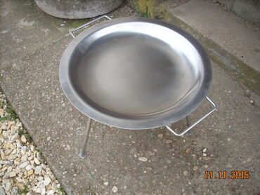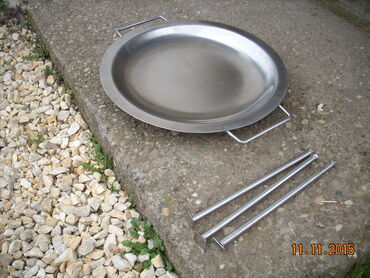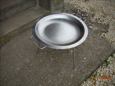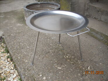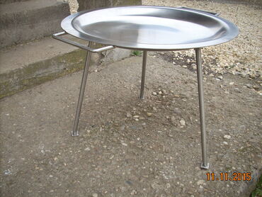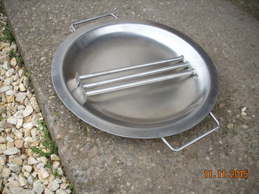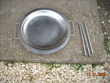 Tanjiraca je velicine precnika 50cm, napravljena od 2mm debljine prohromskog lima otpornog na toplotu! Nogice su velicine 33 cm, Montazne su i nasrafuju se u matice zavarene na tanjiraci.