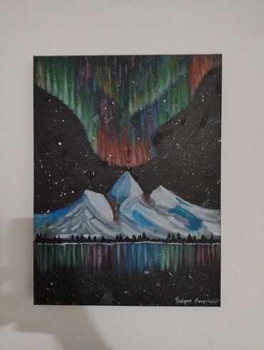 - Motiv 1: Polarna svetlost iznad snežnih planina, zvezdano noćno nebo i odsjaj aurora u mirnom jezeru. Naglašeni kontrasti hladnih plavih i zelenih tonova sa toplim akcentima, sitne bele „pahulje“ stvaraju utisak snežne noći.
