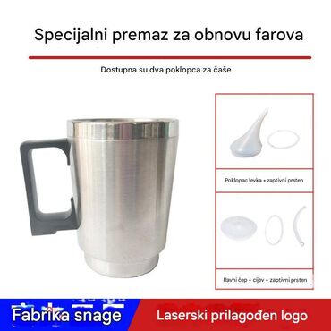 - Materijali: nerđajući čelik (posuda), kvalitetna plastika/silikon (levak, čep, prstenovi).