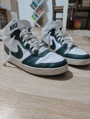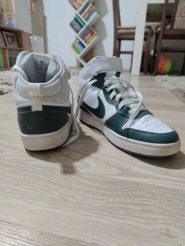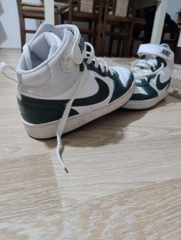 Nike visoke patike – kožne, sa pertlama i čičak kaišem na članku. Model u kombinaciji tamnozelene i bele boje, sa velikim Nike Swoosh logoom sa strane i NIKE natpisom na kaišu. Perforacije na prstima za bolju prozračnost, mrežasti jezik i gornji deo oko članka za udobnost i ventilaciju. Gumeni međuđon i đon pune širine za stabilnost i prianjanje. Klasičan košarkaški/retro stil, pogodan za svakodnevno nošenje.patike nisu nošene ali je od stajanja malo požuteo djon