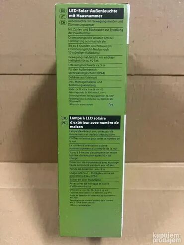 _Uključuje i spoljno svetlo sa detektorom pokreta i senzorom sumraka_ _Sa brojevima i slovima za kreiranje kućnog broja_ _Orijentaciono svetlo se automatski uključuje u sumrak_ _Do 8 sati osvetljenja (u režimu orijentacionog svetla nakon 10 sati punjenja)__Svetlo detektora pokreta sa povećanom osvetljenošću oko 40 sekundi.__Domet detekcije oko 5 m_ _Za spoljašnju upotrebu – otporno na prskanje (IP44)__Kućište od nerđajućeg čelika_ _Uključuje montažni materijal i uputstva za upotrebu_ _Kapacitet baterije: 3x 900 mAh (1,2 V⎓)__Ugao detekcije senzora pokreta: približno 100°_