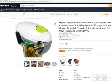 *** AKCIJA *** #0100 One Touch Otvarač za tegle - JAR OPENER; **Automatski jednim dodirom!** Otvarač za tegle će otvoriti tvrdokorne poklopce pritiskom na dugme. Bez uvijanja, bez povlačenja, bez muke. Otvarač za tegle idealan je za ljude sa slabim rukama - jednostavno stavite preko poklopca i pustite One Touch da obavi težak posao. **Pogodan čak i za nove, fabrički zatvorene tegle;** Otvara poklopce od 30 mm do 88 mmRadi na baterije 1,05V AA veličineDimenzije: Dužina 19 cm Širina 6,5 cmVisina 9,5 cm **U EKSTRA stanju kao NOVO!** Informacije **** _Plaćanje možete izvršiti pouzećem ili uplatom pre slanja na tekući račun.__Uplatom pre slanja izbegavate poštarinu za povrat novca preko kurirske službe.__U slučaju da ste iz bilo kog razloga nezadovoljni proizvodom možete ga vratiti u roku od 15 dana i novac ćete dobiti nazad.__Rizik i troškovi slanja idu na teret kupca (kod prijema i kod povrata proizvoda)._****