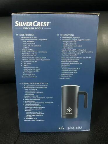 *** AKCIJA *** #1863 Aparat za penu od mleka; Model: SMAS 500 D4; Kapacitet: - količina mleka: min. 75 ml - zagrevanje mleka: maks. 300 ml - količina mleka za penjenje: maks. 150 ml. Snaga: 500W; Potpuno NOVO, neotpakovano! Garancija 3 godine uz fiskalni račun; SilverCrest - Germany; Opis: Za savršenu mlečnu penu za kratko vreme 4 programa koji se mogu izabrati pomoću jednog dugmeta: topla i čvrsta pena Topla i kremasta pena za zagrevanje mleka sa malo pene Hladno penjenje LED svetlosni prsten označava izabrani program (crveno = toplo, plavo = hladno), unutrašnja prevlaka, sa oznakom, bežična, rotirajuća za 360° , 1 mešalica za funkcije "penjenje" i "grejanje", poklopac koji se može skinuti sa zaptivnim prstenom , funkcija automatskog isključivanja Vrhunski nelepljivi premaz od ILAG zaštite od pregrevanja i zaštite od suvog ključanja. Noge protiv klizanja u bazi. Namotavanje kabla. Kapacitet: količina mleka: min. 75 ml zagrevanje mleka: mak. 300 ml mleka za penjenje: mak. 150 ml.