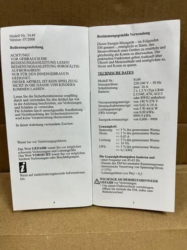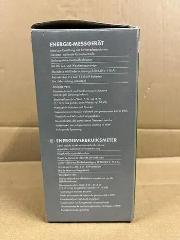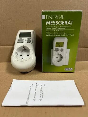 *** AKCIJA *** #2178 Merač potrošnje struje ENERGIE MESSGERAT; Model: 9149; 240V / 16A; Merenje više strujnih karakteristika: Napon (V), Jačina (A), Snaga (W), Max. snaga (W), Energija (kWh); **NOVO, neotpakovano!** **Made in England;** _Opis:_ _Idealan za određivanje potrošnje energije_ _– optimalna kontrola troškova_ _Sa prikazom vremena i dana u nedelji_ _Utičnica sa zaštitom za decu (220-240 V /16 A)_ _Napajanje 2 x AG13 baterije (uključene u isporuku)_ _Prikaz:_ _Potrošnja energije i aktivna snaga u amperima i cos phi (faktor snage)_ _Potrošnja energije u vatima: 5 W - 4416 W (+/-5% izmerene vrednosti +/- 10 VA)_ _vreme merenja u minutima i satima_ _Ukupna potrošnja električne energije tokom merenog vremena u kWh_ _Lokalna tarifa po kWh (unosite sami)_ _Ukupni trošak izmerene potrošnje električne energije_ _Maksimalna potrošnja energije u vatima_ _Trenutni napon_