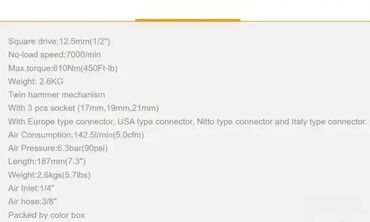 Četvrtasti prihvat: 12,5mm (1/2” )Broj obrtaja bez opterećenja: 7000 rpmMax obrtni moment : 610 NmDvostruki čekić mehanizamSa 3 utičnice (17mm,19mm,21mm)Sa konektorom evropskog tipa, konektorom tipa SAD, konektorom tipa Nitto i konektorom tipa Italija. Potrošnja vazduha: 142.5l/min (5.0cfm)Pritisak vazduha: 6,2 bara (90 psi)Dužina: 187 mm (7,3” )Težina: 2,6 kg (5,7 lbs)Ulaz za vazduh: 1/4” Crevo za vazduh: 3/8”
