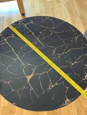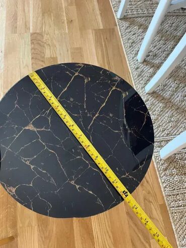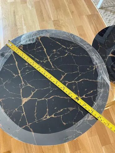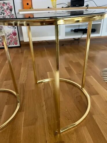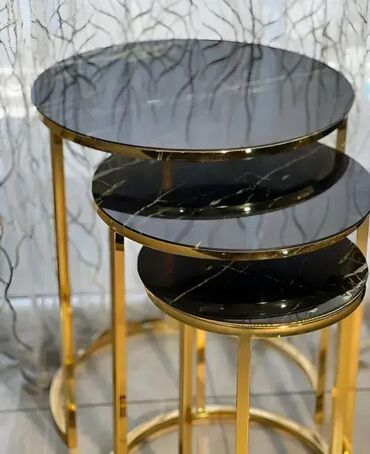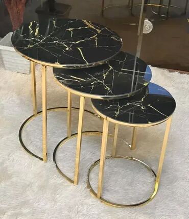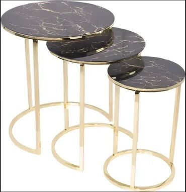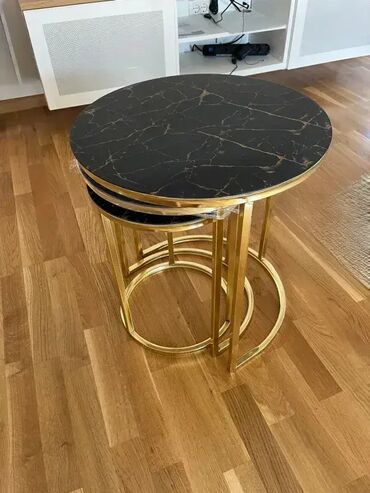 Set klub stolova sa mermernim dezenom i "zlatnim" metalnim nogama; Materijal: Ploča od melamina sa dezenom crnog mermera, metalne noge u zlatnoj boji. Stolovi se mogu složiti jedan ispod drugog radi uštede prostora ili koristiti zasebno;