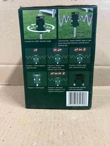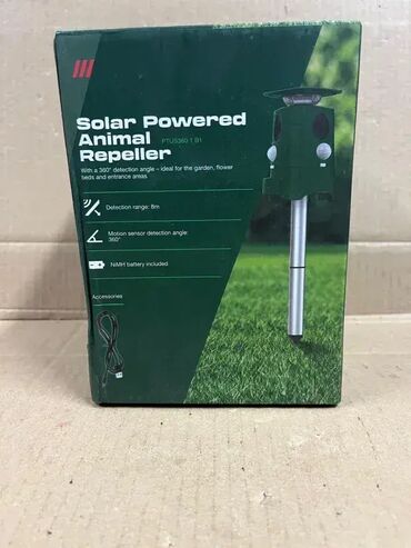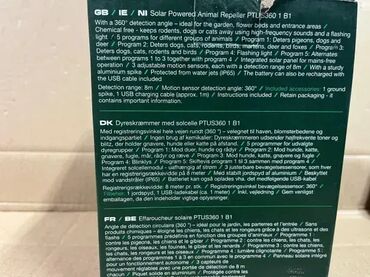 Pokupiti na licu mestaAparat za odbijanje životinja; Model: PTUS360 1 B1; Potpuno NOVO, neotpakovano! PARKSIDE Germany; Karakteristike: Sa uglom detekcije u svim pravcima (360° ) – idealno za baštu, cvetne gredice i ulazne prostore Koristi se bez hemikalija – drži glodare, pse ili mačke podalje pomoću visokofrekventnih tonova i trepćućih svetla 5 programa za odabrane grupe životinja Program 1: Protiv golubova, pasa i divljih životinja Program 2: Protiv pasa, mačaka, glodara, ptica, kuna, divljih životinja i lisica Program 3: Protiv pasa, mačaka, glodara i ptica Program 4: Trepćuće svetlo Program 5: Smenjuje programe od 1 do 3 i program 4 Integrisani solarni panel za rad van mreže 3 podesiva senzora pokreta, svaki sa dometom detekcije od 8 m Sa čvrstim aluminijumskim šiljkom za zemlju Zaštićeno od mlazeva vode (IP65) Baterija se takođe može puniti pomoću priloženog USB kabla Uključena dodatna oprema: 1x šiljak za zemlju 1x USB kabl za punjenje (približno 1 m) Tehničke specifikacije Domet detekcije: 8 m svaki Ugao detekcije senzora pokreta: 360° Materijal Kućište: Plastika Šipak za zemlju: Aluminijum Solarni modul: Monokristalna plastika Dimenzije Kućište: približno Ø 115 x D 137 mm Šipak za zemlju: približno Ø 25 x D 130 mm Navojni uložak: približno Ø 25 x D 26 mm Težina: približno 325 g
