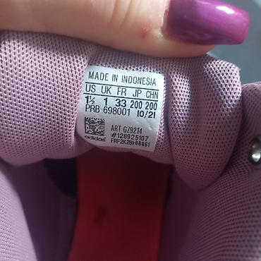- Boja: pudrasto roze/lila sa fluorescentno narandžastim detaljima i belim Adidas prugama