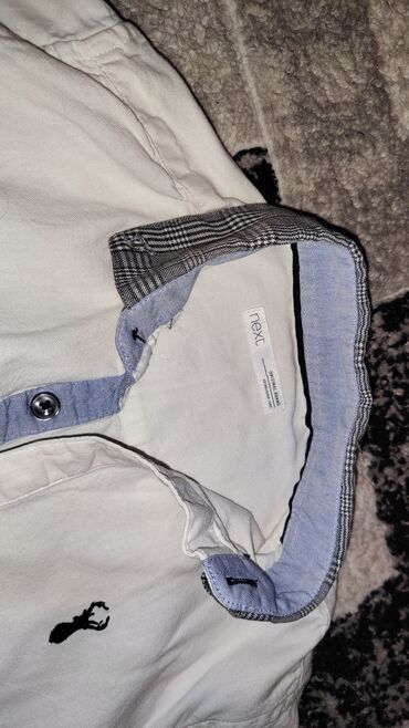 - Košulja 3: svetla košulja sa kontrastnim plavim detaljima na unutrašnjoj strani kragne, dugmadi i manžetnama; vezena silueta jelena na grudima. Brend: Next (etiketa vidljiva).