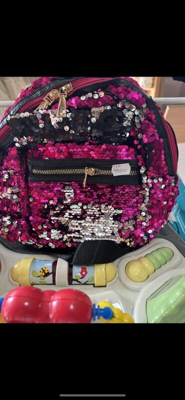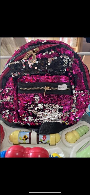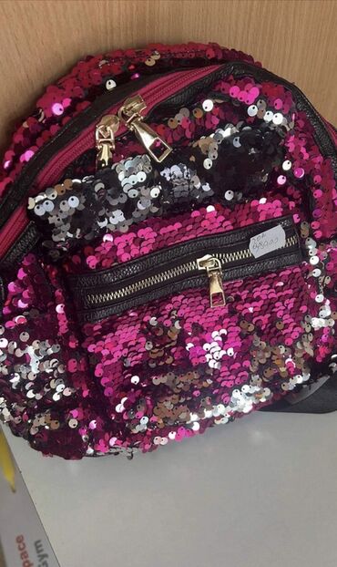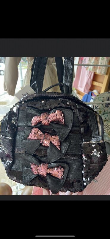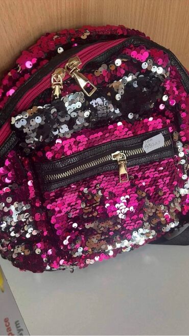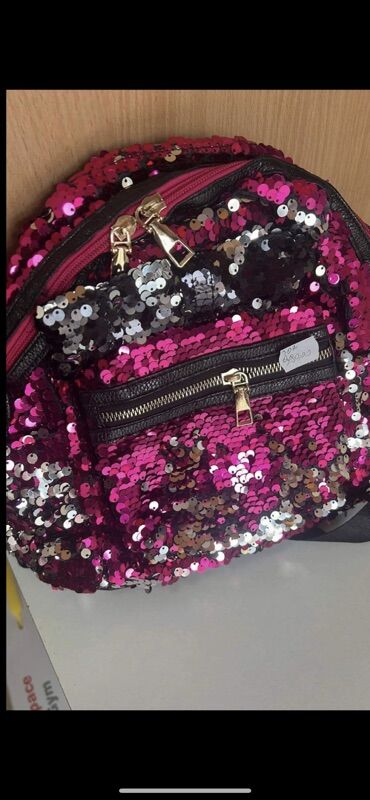 - Dizajn: ceo ranac prekriven sjajnim dvostranim šljokicama u ružičasto‑srebrno‑crnim tonovima; na jednoj varijanti ispred su tri dekorativne mašne od eko‑kože sa šljokicama.
