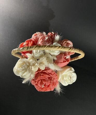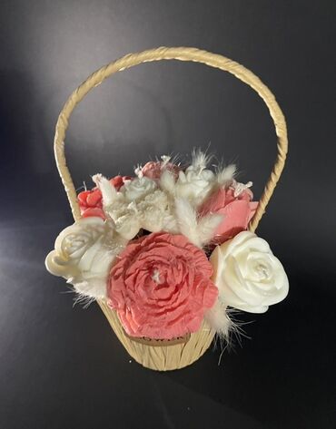 - Unutra set sveća u obliku cvetova: ruže i božuri u nijansama bele i nežno roze/koralne.