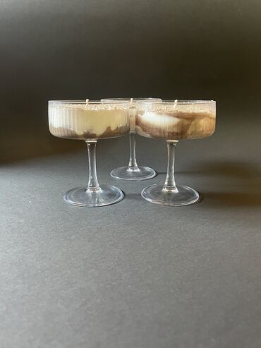 - Dimenzije (približno po komadu): čaša tipa kupa sa visokim stalkom; niska, široka forma pogodna za stabilno gorenje i dekorativan prikaz slojeva