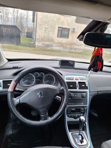 Peugeot 308 – hečbek u tamnoplavoj boji. Ključne karakteristike: - Motor: benzinski ili dizel (model 308, prednja maska sa hromiranom lajsnom i LED farovima) - Menjač: automatski (prepoznatljiva a...
