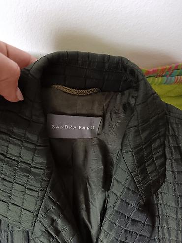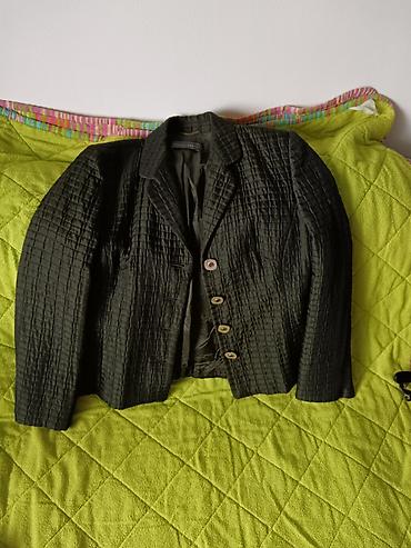 Zeleni ženski sako sa etiketicom, model sa strukiranim krojem . Univerzalan za S,M,L veličinu. Klasičan rever, dugi rukavi i diskretni šavovi koji naglašavaju liniju struka. Glatka, čvršća tkanina...