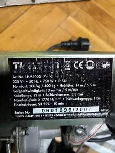 - U kompletu: vitlo sa motorom i zaštitnim kućištem, remenice/koloturnik sa kukom, dodatna kuka, dve metalne montažne konzole, priručnik