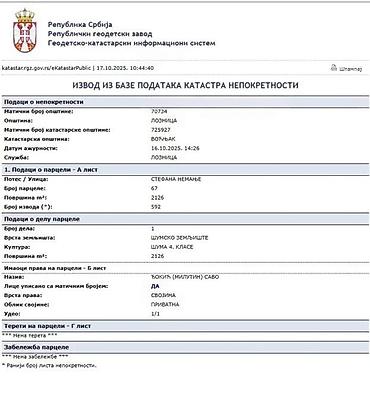 Dodatno: Parcela je izdvojena uz rub šumskog pojasa i polja, pruža privatnost i lepe poglede, a istovremeno je relativno blizu postojećih saobraćajnica i naselja. Katastarski izvod i plan dostupni na uvid na fotografijama oglasa.