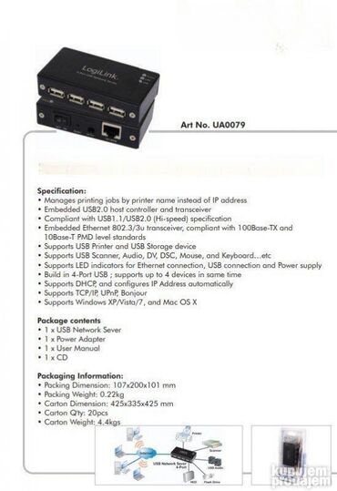 Pokupiti na licu mestaInput: 4x USB-A female LAN connector: RJ45 female LAN: IEEE 802.3, 10/100 MBit/s Compliance with USB 2.0 standard DHCP client with automatic logon Configuration via browser interface Power supply included Aluminium housing; Features: Manages printing jobs by printer name instead of IP addressEmbedded USB2.0 host controller and transceiverCompliant with USB1.1/USB2.0 (Hi-speed) specificationEmbedded Ethernet 802.3/3u transceiver, compliant with 100Base-TX and 10Base-T PMD level standardsSupports USB Printer and USB Storage deviceSupports USB Scanner, Audio, DV, DSC, Mouse, and Keyboard… etcSupports LED indicators for Ethernet connection, USB connection and Power supplyBuild in 4-Port USB ; supports up to 4 devicesin same timeSupports DHCP, and configures IP Address automaticallySupports TCP/IP, UPnP, Bonjour