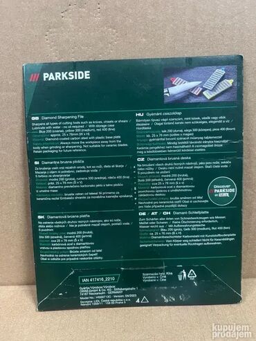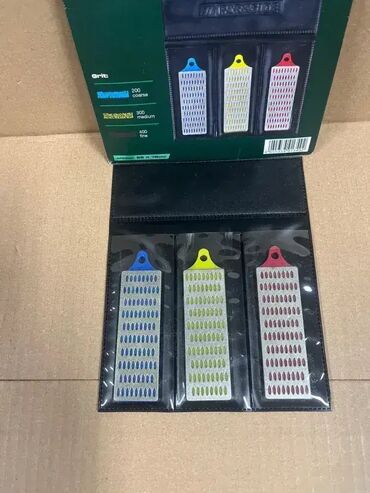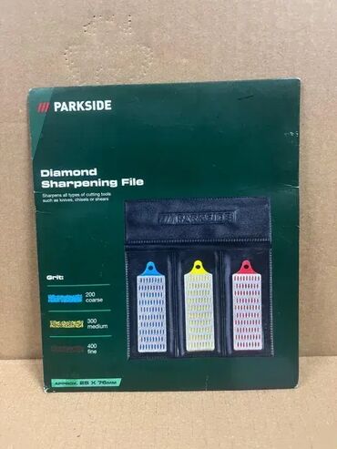 NovoKomplet dijamantskih turpija za oštrenje; 3 turpije finoće 200, 300 i 400; U praktičnoj futroli za čuvanje; PARKSIDE - Germany; NOVO, neotpakovano! Tri finoće: plava 200, žuta 300, crvena 400. Za oštrenje dleta, noževa i svih ostalih oštrica kao i za generalno turpianje. Dijamantska turpija za oštrenje: Oštri sve vrste alata za sečenje kao što su noževi, dleta ili makaze. Mogućnost vodenog brušenja. Sa praktičnom futrolom za čuvanje. Zrnatost: plava 200 (gruba), žuta 300 (srednja), crvena 400 (fina). Dimenzije: pribl. 25 x 76 mm (Š × V). Materijal: ugljenični čelik obložen dijamantom sa plastičnom osnovnom pločom.